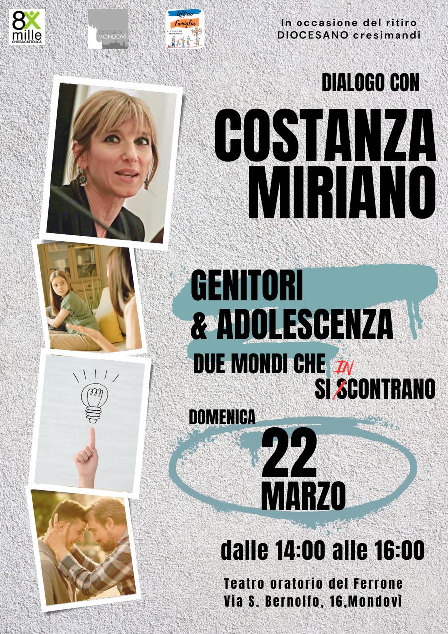 L’Ufficio Famiglia della Diocesi di Mondovì ha organizzato, domenica 22 Marzo alle ore 14:00 nella Parrocchia del Ferrone a Mondovì, un incontro aperto a tutti i genitori nel quale interverrà la nota giornalista e scrittrice Costanza Miriano.