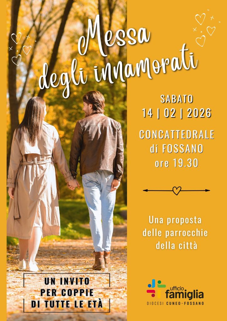 Sabato 14 febbraio alle 19.30 in Concattedrale a Fossano ritorna la celebrazione dedicata agli innamorati di ogni età, proposta oramai da molti anni da parroci e diaconi della città , nel giorno tradizionalmente dedicato a San Valentino. All’interno della Messa presieduta da don Davide, introdotta da una canzone e animata dai cori delle parrocchie dell’Unità pastorale del Centro storico, verrà proposto un gesto di benedizione sul cammino di ciascuno. L’evento si avvale della collaborazione del gruppo liturgico e dell’Ufficio famiglia diocesano.