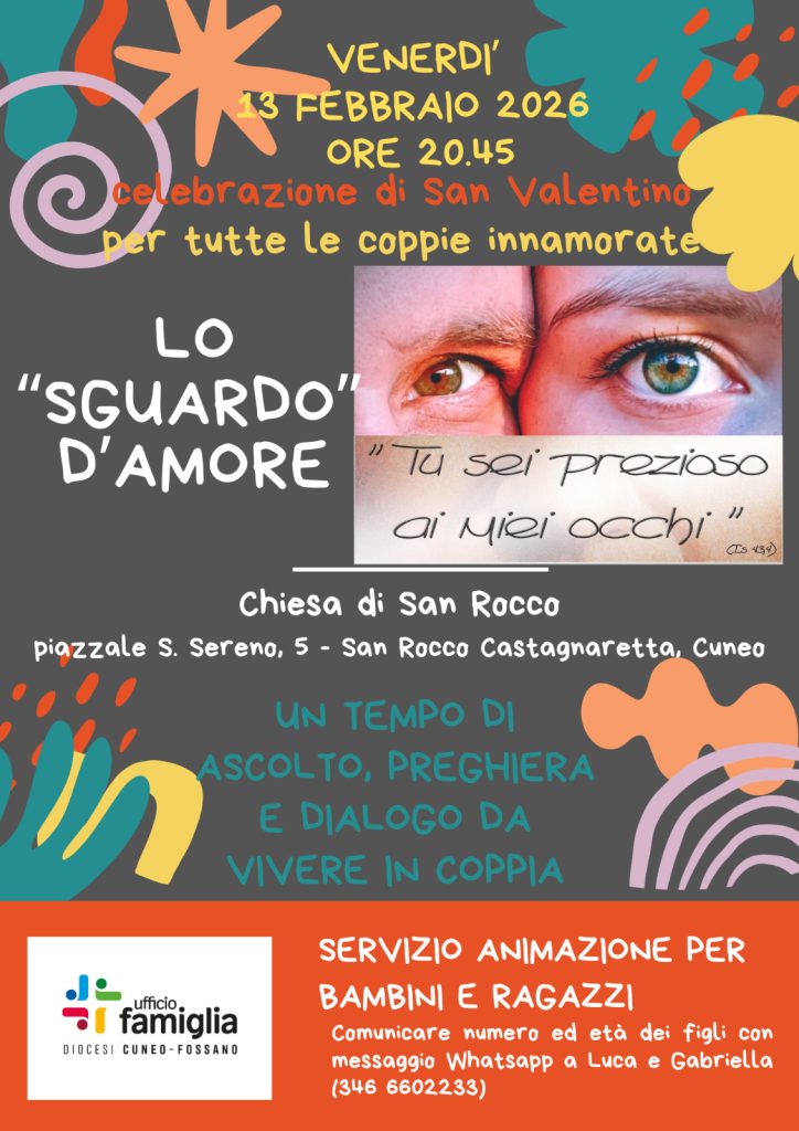 Venerdì 13 febbraio 2026 alle ore 20.45 presso la Chiesa di San Rocco Castagnaretta a Cuneo si terrà la celebrazione di San Valentino, un appuntamento aperto a tutte le coppie innamorate, senza distinzioni di età o di cammino. Il titolo della serata, Lo “sguardo” d’amore, richiama la Parola del profeta Isaia: «Tu sei prezioso ai miei occhi». Uno sguardo che non giudica, ma riconosce; che non dà per scontato, ma custodisce. Proprio da qui nasce la proposta: offrire alle coppie un tempo di ascolto, di preghiera e di dialogo, da vivere insieme, per rallentare il ritmo quotidiano e ritrovare ciò che spesso resta nascosto dietro le urgenze di ogni giorno.