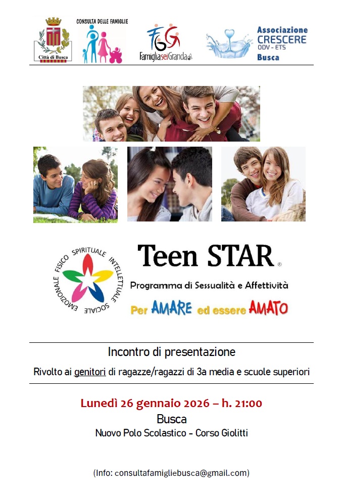 La Consulta delle famiglie di Busca è lieta di proporre, anche per il 2026, il corso TEEN Star: un percorso di educazione all’affettività ed alla sessualità per ragazze e ragazzi che frequentano la 3a media e le scuole superiori.