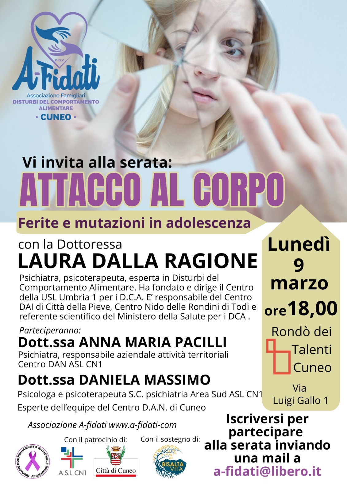 Appuntamento al Rondò dei Talenti, a Cuneo in Via L. Gallo 1, lunedì 9 marzo alle 18.00, per partecipare inviare mail all’indirizzo a-fidati@libero.it, per maggiori info e divulgazione dell’iniziativa, consultate la locandina.